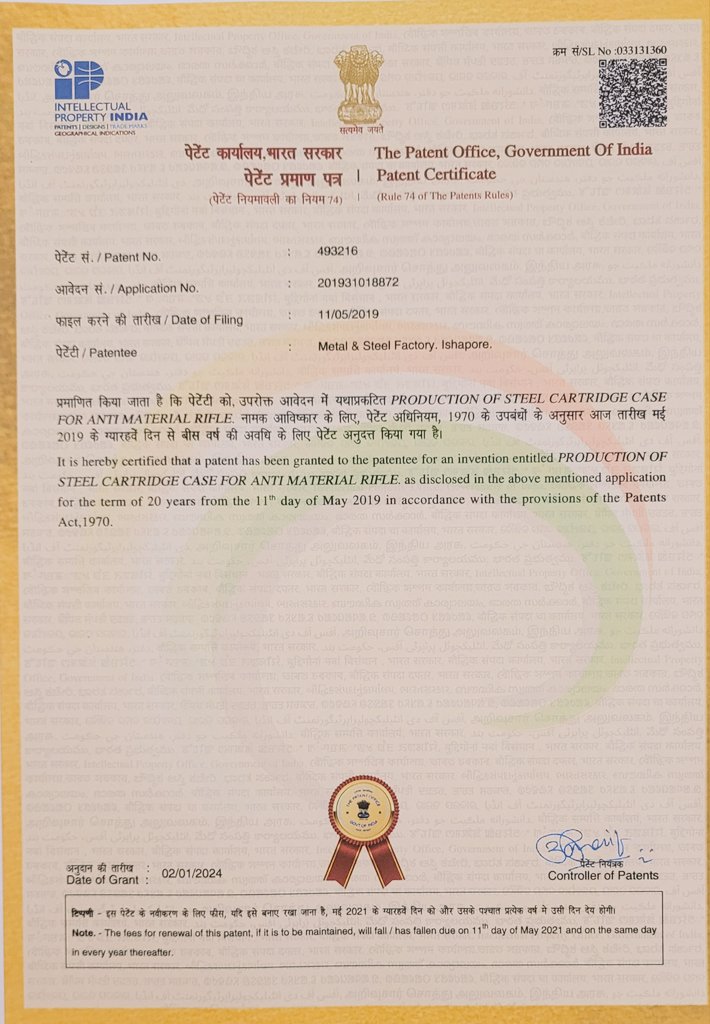 • — Patent Certificate for Steel Cartridge Case : MSF